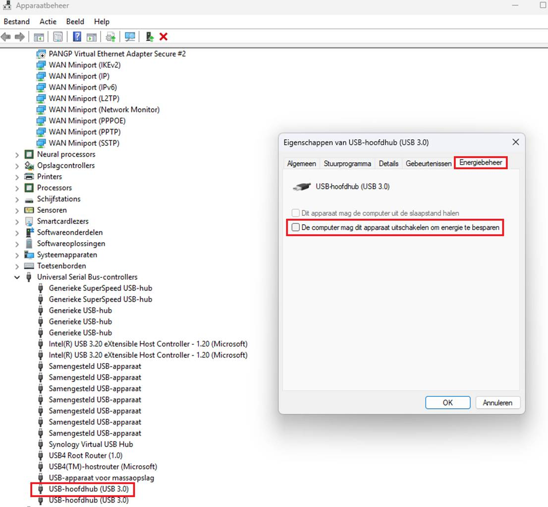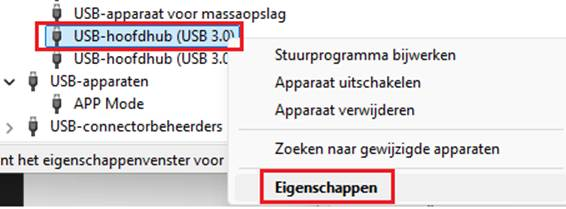 Mocht de USB uitvallen tijden het programmeren, dan kan het helpen om de rechten van de desbetreffende USB poort/apparaat in apparaatbeheer aan te passen.